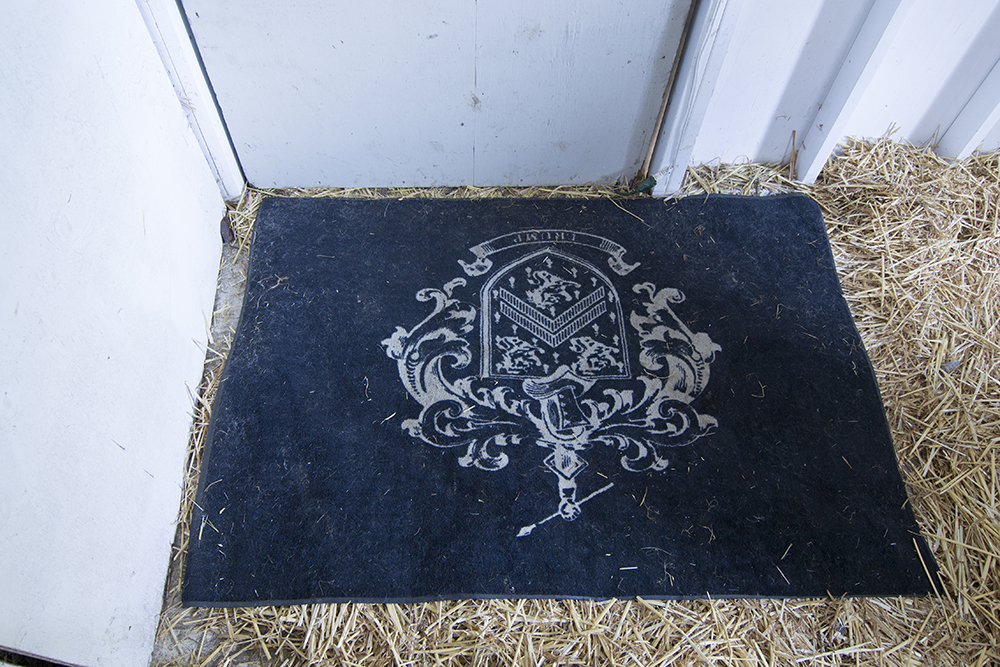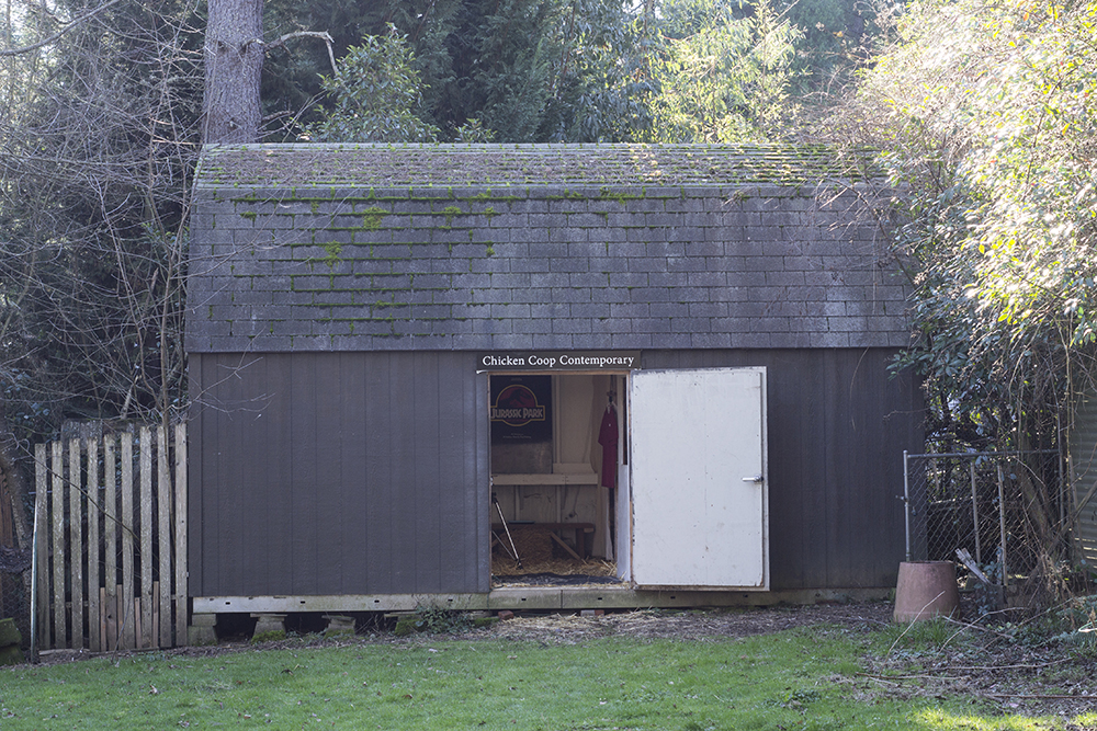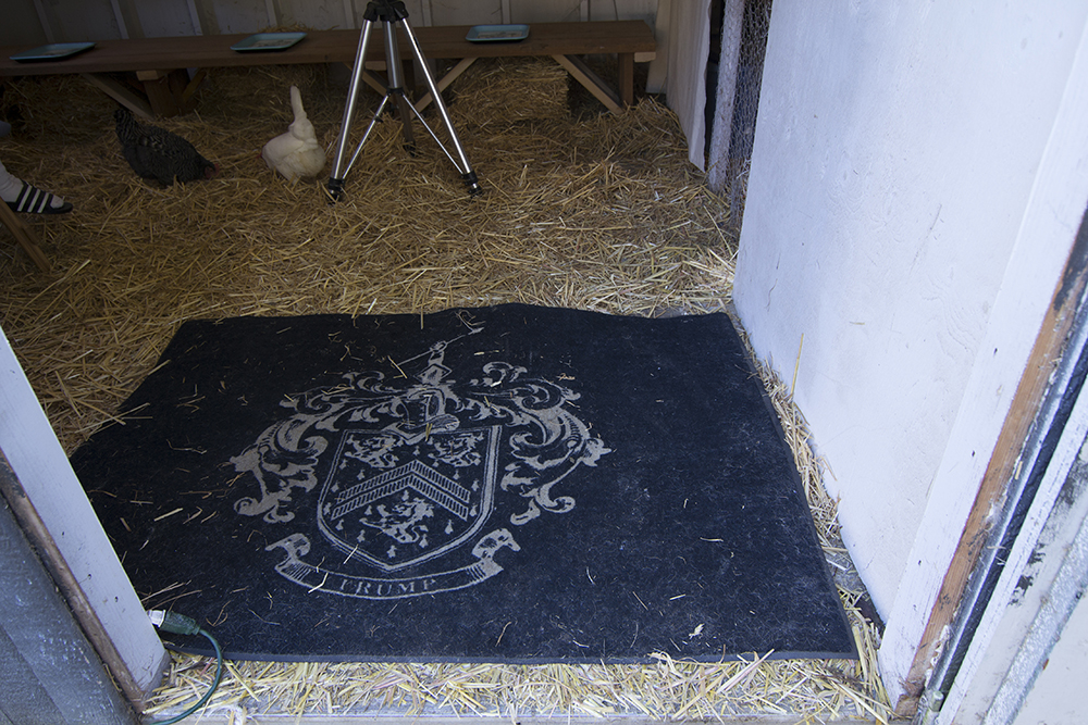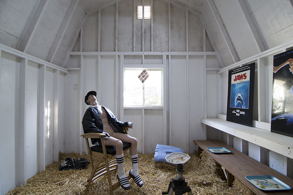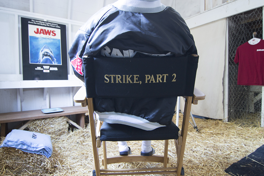 Striker, CPR manikin, vintage Pittsburgh Pirates baseball cap, vintage Los Angeles Raiders jacket, tube socks, adidas slide sandals, custom director’s chair, 2015