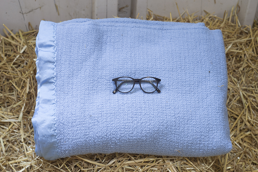 Cold Discoveries, Artist’s eyeglasses, artist’s hand-me-down blanket, 2018