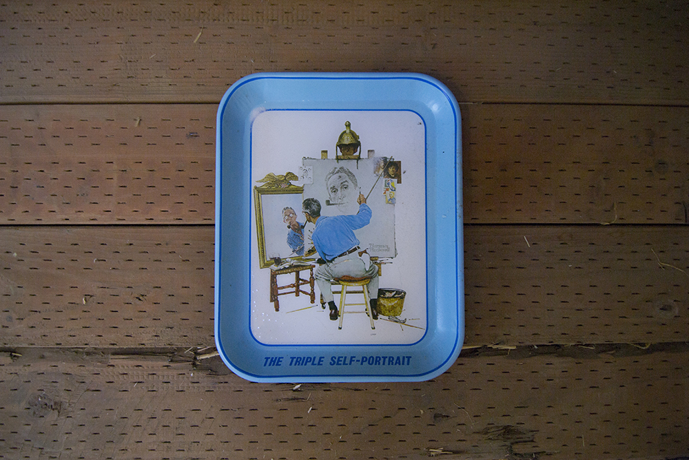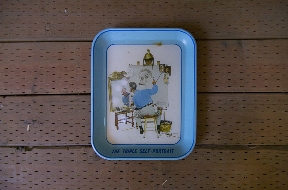 The Triple Self-Portrait, Three limited edition Norman Rockwell trays, Nine Tramadol pills, Perrier, 2018
