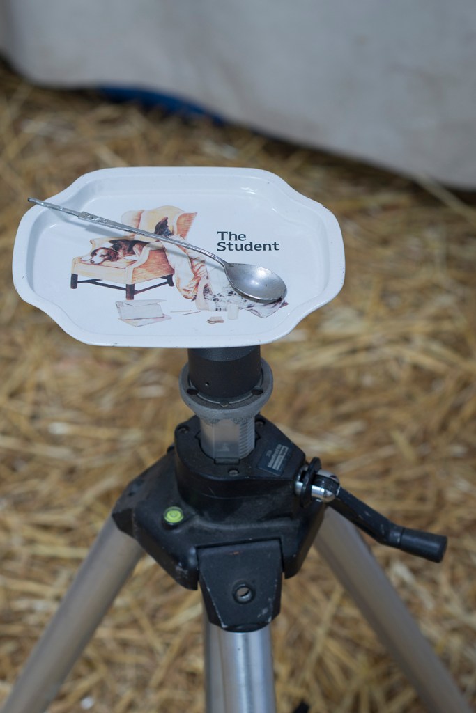 The Student, Limited edition Norman Rockwell tray, modified spoon found stabbed in the side artist’s automobile tire, tripod, 2018
